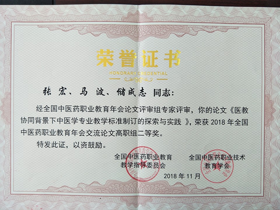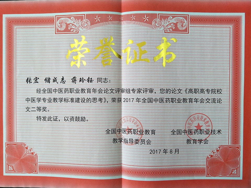 全国中医药职业教育年会交流论文二等奖